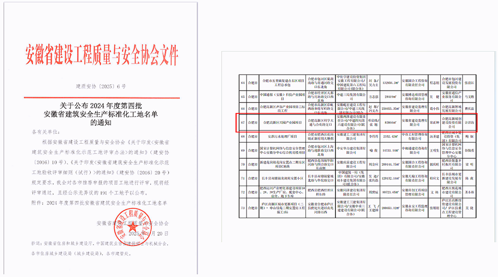 日前,安徽省建設工程質量與安全協會公布2024年度第四批安徽省建筑安全生產標準化工地名單,由安徽兩淮建設有限責任公司牽頭承建的合肥高新區興園產業園項目光榮上榜。