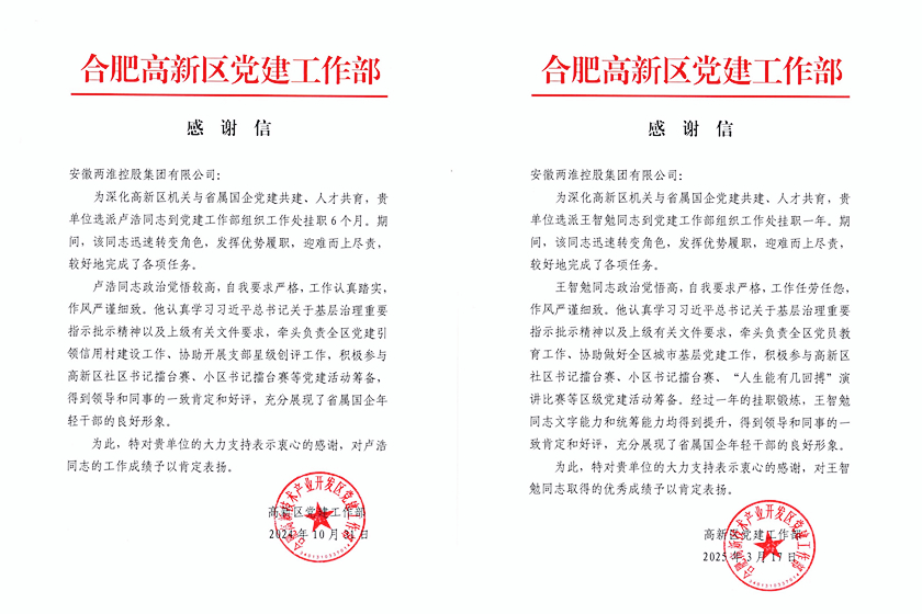 近日,合肥高新區黨建工作部致信兩淮控股集團,對我單位盧浩、王智勉兩名同志在管委會跟班學習期間的工作表現給予充分肯定與表揚。
