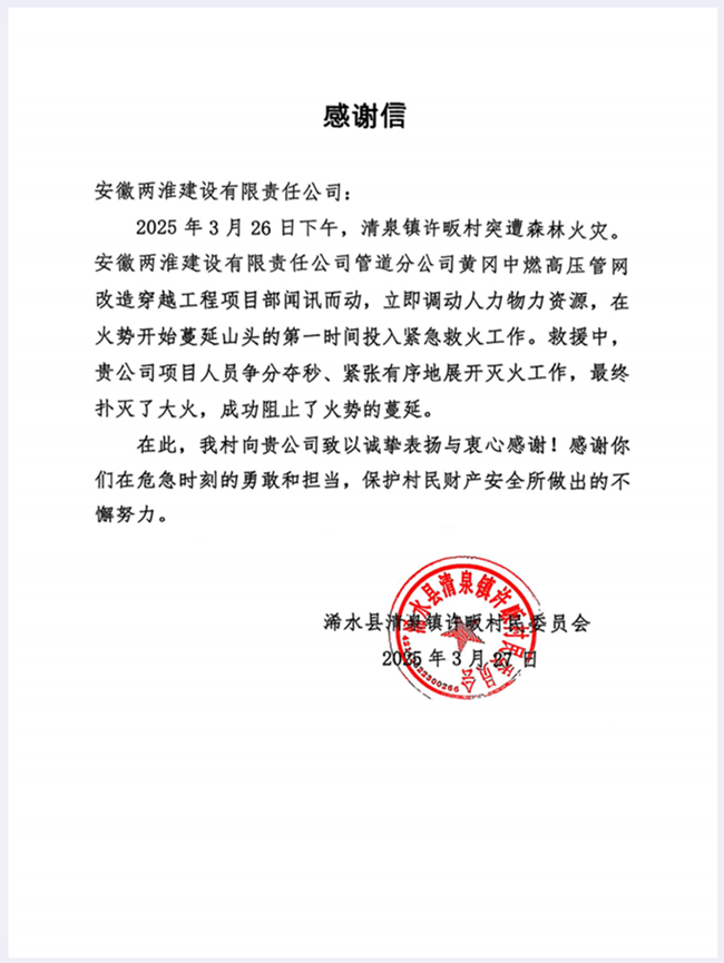 事后,當地村委會向項目機組人員表示誠摯感謝,并送上了感謝信。此次火情的成功撲滅,離不開兩淮建設管道分公司黃岡項目人員的迅速聯動、沖鋒在前。他們不僅及時有效地阻止了火情的進一步擴大,也切實保障了保障了當地生態環境和村民的安全,充分彰顯了“兩淮人”的社會責任感與擔當精神。